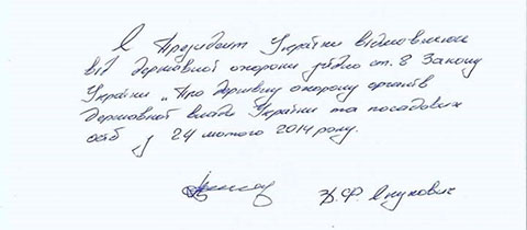 Частина співробітників УДО висловили бажання «залишитися тут». Янукович, попрощавшись з ними - передав офіційну ВІДМОВУ ВІД ДЕРЖАВНОЇ ОХОРОНИ (докладаю скан). Співробітники управління державної охорони, які не пішли за ним, забрали всю державну зброю для передачі її в кримське відділення УДО», - написав Арсен Аваков.