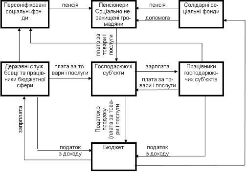 В цій системі підприємства сплачують у бюджет невеликі платежі (екологічні і т.д.). Основна маса коштів сплачується у вигляді зарплати працівникам підприємств та бюджетних установ, пенсій - пенсіонерам, та допомог - іншим громадянам, які перебувають на утриманні держави. Громадяни, отримавши на руки великі кошти, матимуть змогу на свій розсуд ними розпоряджатися (споживати, забезпечувати медичне, пенсійне і т.д. страхування). Бюджет формуватиметься, в основному, за рахунок оподаткування споживання (податок на доходи громадян, податок з продажу).