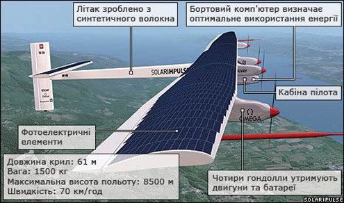 Літак використовує нові енергоефективні фотоелектричні елементи і сонячні батареї, за допомогою яких він тримається у повітрі після заходу сонця.