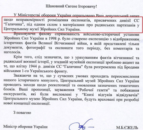 "Крім того, слід зазначити, що з урахуванням фактів вітчизняної та радянської воєнної історії, у згаданій музейній експозицій зроблено акцент на те, що влітку 1944 року дивізія СС "Галичина" була розгромлена під Бродами військами 1-го Українського фронту", - пояснює міністр депутату-комуністу.