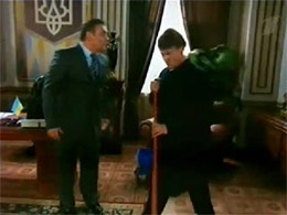 І, нарешті, в пародії пролунав відкритий натяк на епізод, куди більш відомий в інтернеті, ніж в телеефірі. На Януковича, який тільки-тільки відчув свою повну всемогутність, падає траурний вінок.