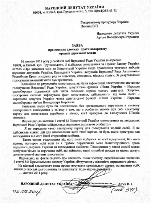 Депутат в заяві на ім'я генпрокурора Віктора Пшонки зазначив, що відповідно до частини 3 статті 84 Конституції України “голосування на засіданнях Верховної Ради України здійснюється народним депутатом особисто.”