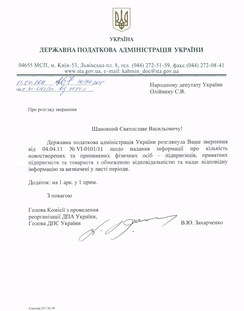 Як йдеться в статдовідці, наданій ДПАУ С.Олійнику, у січні-березні 2011 року припинили свою діяльність 56 тис. 613 фізичних осіб – підприємців, 1238 приватних підприємств, 1772 товариств з обмеженою відповідальністю. За цей же період було зареєстровано 44 тис. 009 нових фізичних осіб – підприємців, 311 ПП, а також 1906 товариств з обмеженою відповідальністю.