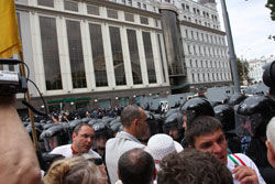 Як повідомлялося раніше, незважаючи на заборону суду проводити акції опозиції в будь-яких місцях, крім парку Шевченка, учасники мітингу з нагоди Дня Незалежності України мали намір іти пішою ходою до Адміністрації Президента, щоб передати главі держави Віктору Януковичу резолюцію, яку вони затвердили.