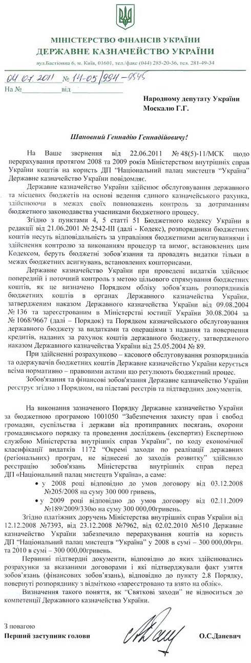 "Державне казначейство України підтвердило, що перерахування бюджетних коштів МВС на користь ДП "Національний палац мистецтв "Україна" (в чому звинувачують екс-міністра МВС Луценка) не було нецільовим використанням бюджетних коштів", – заявив Москаль.