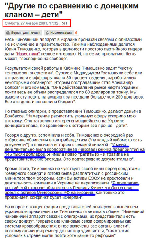 Проте, як з'ясувала "Українська правда", під виглядом нового інтерв'ю Тимошенко з СІЗО "Известия" опублікували інтерв'ю Тимошенко 2001 року, в якому вона коментує справу ЄЕСУ.