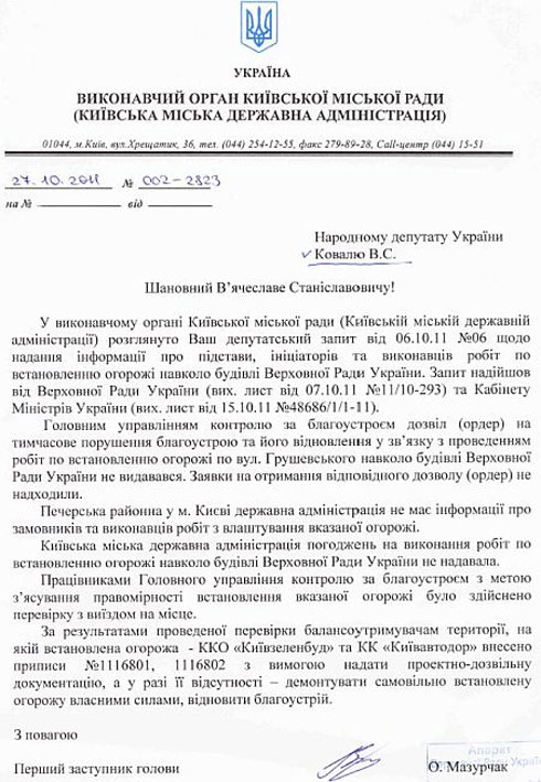 "Головним управлінням контролю за благоустроєм дозвіл (ордер) на тимчасове порушення благоустрою та його відновлення у зв’язку з проведенням робіт по відновленню огорожі по вул. Грушевського навколо будівлі Верховної Ради не видавався. Заявки на отримання відповідного дозволу (ордеру) не надходили", - сказано в ньому.
