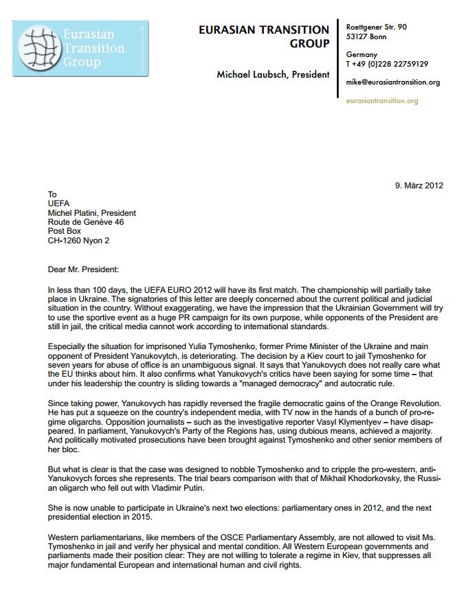 "Уже менше, ніж за 100 днів, відбудеться перший матч Євро 2012. Цей чемпіонат частково відбудеться в Україні. Підписанти даного листа глибоко стурбовані поточною політичною та судовою ситуацією в цій країні. Без перебільшення, у нас склалося враження, що влада України спробує використовувати цю подію для власної піар-кампанії, тоді як опоненти президента перебувають за ґратами, а критично налаштовані ЗМІ не можуть працювати відповідно до міжнародних стандартів.