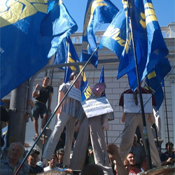 Як відомо, 30 липня 2012 року о 9:00 розпочалася акція "Наша мова – наша свобода" проти спроби протягнути в парламенті українофобський "мовний" законопроект Ківалова-Калєснічєнка. По вулиці Грушевського вишикувалася колона активістів ВО "Свобода", Об’єднаної опозиції ВО "Батьківщина" та громадських активістів.