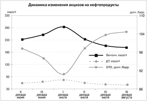 У міру зростання нафтових котирувань в липні акциз знизився, на початку серпня впритул наблизившись до базових (див. графік).