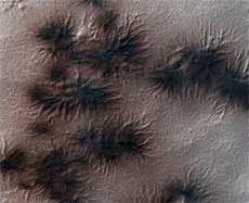 На знімку кожен такий "павук" має діаметр близько 100 метрів. Фотографія була отримана камерою HiRISE 26 вересня цього року з відстані 262 кілометри.