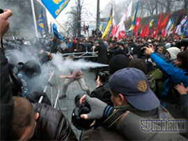 У голові колони виявилися представники "Свободи". У міліцейські ряди, вишикувані біля будівлі Кабміну, полетіли димові шашки, деякі мітингувальники намагалися підсунути металеву огорожу навколо міліції. У хід пішли балончики сльозогінного газу.