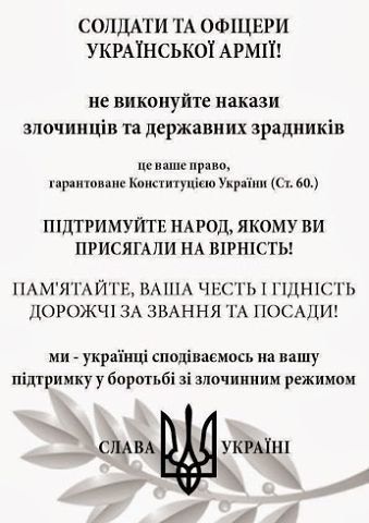 Ставши сьогодні на боці українського народу, ви не лише стаєте на боці Добра, але й забезпечуєте власне майбутнє і майбутнє власних родин. У нинішній державі ви приречені бути шістками, найманцями злочинної влади, що обслуговує інтереси великого олігархічного капіталу. В майбутньому ви можете стати співгромадянами вільної національної держави, котра дбає про інтереси усього суспільства. Подбайте про майбутнє власних дітей!
