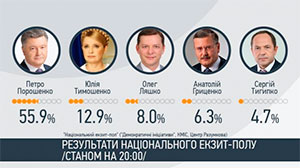 За даними Всеукраїнського телевізійного екзит-полу Петро Порошенко отримав 57,3% голосів. Це означає, що скорш за все, другого туру президентських виборів не буде.