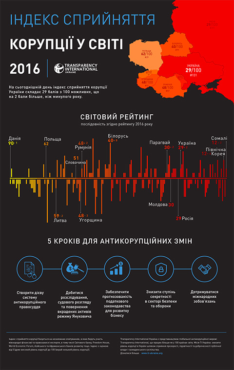 Цю сходинку із показником 29 балів разом з Україною посіли також Казахстан, Непал, Росія, Іран (0 балів – найгірший можливий показник, 100 – найкращий). І хоч у порівнянні з 2015 роком Україна покращила свій рейтинг і отримала на 2 бали більше, ніж у році позаминулому – цього замало для держави, в якій влада називає подолання корупції головним пріоритетом, відзначає українське представництво Transparency International.