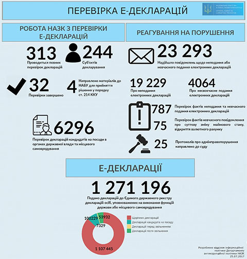 Всього до Департаменту фінансового контролю та моніторингу способу життя НАЗК у 2017 році надійшло 23 293 повідомлення, з них: 19 229 повідомлень про неподання декларацій та 4064 – про несвоєчасне подання. Проводиться 787 перевірок фактів неподання та несвоєчасного подання електронних декларацій та 75 перевірок фактів невчасного повідомлення про суттєву зміну майнового стану, відкриття валютного рахунку.