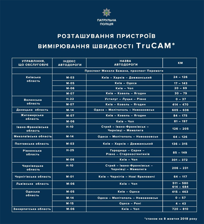"Портативний пристрій вимірювання швидкості TruCam будуть використовувати виключно на ділянках доріг, де встановлені відповідні дорожні знаки, а перелік таких місць буде в у відкритому доступі", - зазначається у повідомленні.