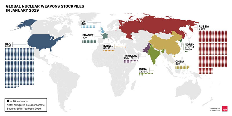 Станом на початок 2019 року, дев’ять країн: США, Росія, Великобританія, Франція, Китай, Індія, Пакістан, Ізраїль та Північна Корея мали 13 865 ядерних боєголовок.
