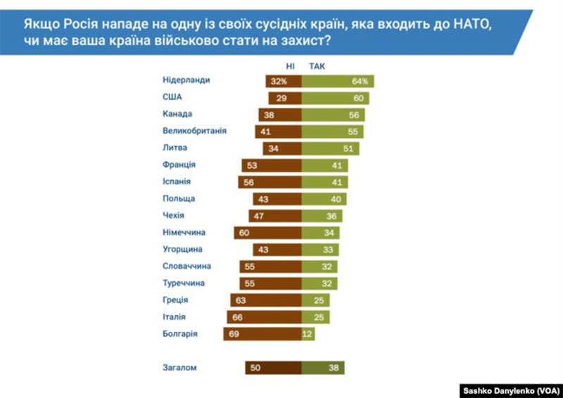 Опитування провели у 16 з 29 країн, що входять до альянсу. Питання звучало так: “Якщо Росія нападе на одну із своїх сусідніх країн-членів НАТО, чи має ваша країна військово встати на захист?” (Росія межує з чотирма державами-членами НАТО: Естонією, Латвією, Литвою, Польщею, – ред.)