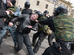 На звуки прибігли більше десятка охоронців, які вивели відвідувачів виставки з будівлі центру. Євроазійці, закінчивши розгром, чинили опір співробітникам охорони. Кільком вдалося прорватися на вулицю з приміщення центру.