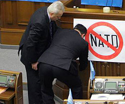 На трибуні парламенту на синьому фоні написано «НАТО не пройде», на трибуні, де знаходиться місце Президента України, вивішений лозунг «НАТО? Ніколи!!!».