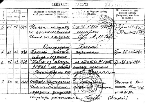 У період між 1980 та 1987 рр. записи про будь-яку трудову діяльність Гриценка А.П. в його трудовій книжці – відсутні.
