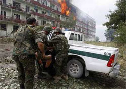 м.Горі. Грузинські поліцейські збирають останки вбитих після знищення “війскового об`єкту” російськими льотчиками |