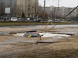 Варто окремо зазначити, що у столиці є навіть ціла бюрократична одиниця, яка має опікуватися доглядом і ремонтом доріг. Випадок на Борщагівці наочно показав: клептоманам-бюрократам просто немає часу займатися виконанням своїх обов'язків. Бо навіть огорожа та попереджувальний знак біля ями, де затонула автівка - відсутні.