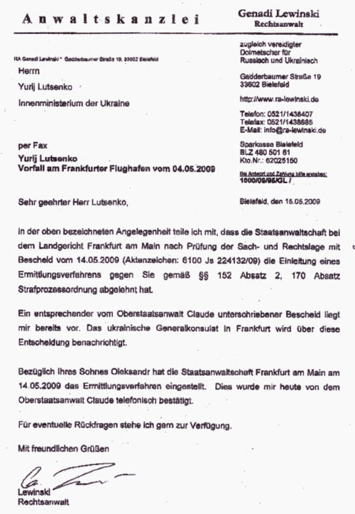 Щодо вказаного вище приводу повідомляю Вас про те, що прокуратура при земельному суді міста Франкфурт-на-Майні після вивчення змістовних та правових питань відповідно до абзацу 2 § 152, § 170 Кримінально-процесуального кодексу Німеччини рішенням від 14 травня 2009 року відмовила у проведенні попереднього розслідування стосовно вас.