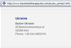 сторінка з контактною інформацією Baxter для України підтверджує присутність корпорації в країні.