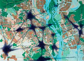 Ілюстрація одного з сайтів, що пропонують послуги з нейтралізації геопатогенного впливу. Похмурі фіолетові тіні геопатогенних зон нібито нависли над Києвом