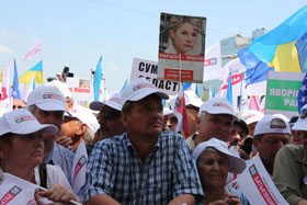 «Кульмінацією» дійства традиційно стає мітинг. Зібрання на Європейській площі 18 травня не стало виключенням. Промови сценарних спікерів, ретельно «опрацьовані» спічрайтерами і політтехнологами, зачитуються «залізними голосами» з аматорською епатажністю. Демонстранти з нудьгуючими обличчями тримають банери та прапори, всім своїм виглядом показуючи боротьбу сили волі з бажанням організму піти геть з пекучого сонця. А ще краще – до «десятника» за чесно заробленими 100-150 гривнями. Саме наявність мотивації «неоподаткованого» гонорару й є тим елементом, який відрізняє сучасні масові акції влади від тих, що «добровільно-примусово» відбувалися в СРСР.