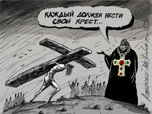 Отже, якщо ви молодий монашок на білому «Геленвагені», то у ваших кровних інтересах наблизити умови життя співвітчизників максимально близько до тюремних. Особливо важливо не допускати проникнення на Святу Русь таких бездуховних західних збочень, як демократія і вільний ринок - механізмів, завдяки яким можна і керувати власним життям, і впливати на суспільство навколо. Люди повинні жити і вмирати з волі всемогутньої державної машини. Будучи позбавлені можливості будувати довготривалі плани, вони візьмуться за різні форми ірраціональної, деструктивної поведінки. Одні будуть побиватися горілкою і героїном, інші набирати споживчих кредитів скільки зможуть віднести, зате треті - кинуться цілувати вашу добру пастирську руку.