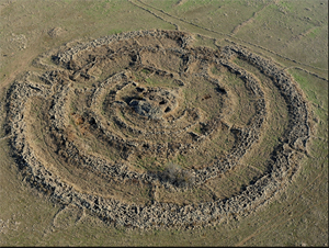 Колесо духів, Руджум-ель-Хірі | Колесо Духів або Руджум-ель-Хірі — прадавня споруда в Ізраїлі на Голанських висотах, яка, за даними дослідників, може бути древнішою за Стоунхендж. Однак її дослідження ставить перед археологами більше питань, ніж дає відповідей.Назва його Руджум-ель-Хірі перекладається з арабської як «Курган Дикої кішки» - вірогідно, в пам’ять про яку-небудь рись, що жила там не так давно: максимум років триста-чотириста тому. На івриті це місце частіше називають «Колесом Духів» - і фотографії з повітря добре пояснюють чому: комплекс являє собою гігантські концентричні кола, складені з базальтових брил, і центральний курган з ритуальною камерою. За оцінками, на будівництво такої споруди пішло приблизно 100 тисяч людино-днів. При цьому і призначення, і датування комплексу залишаються питаннями без відповіді. За декілька сезонів перших розкопок після того, як в 1968 році наукова громадськість дізналася про існування Руджум-ель-Хірі, археологи знайшли на диво мало.
