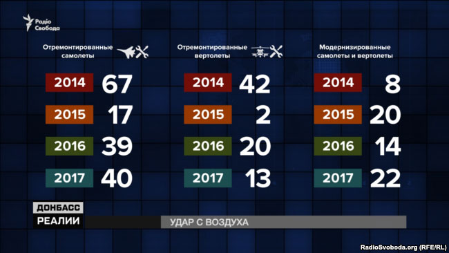 За даними Міністерства оборони України, в період з 2014-го до 2017 року в ЗСУ відремонтували більше ніж 160 літаків і майже 80 вертольотів. Модернізацію пройшли понад 60 повітряних суден.