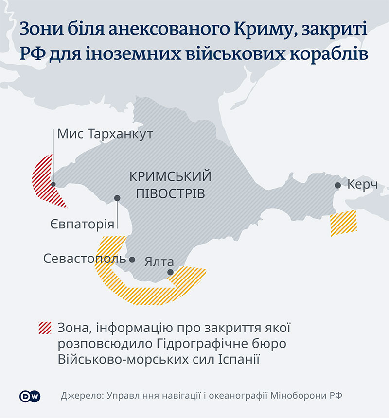 Починаючи від 24 квітня і до кінця жовтня, Росія оголосила про закриття трьох морських районів поблизу узбережжя анексованого Криму. Йдеться про 12-мильну прибережну зону, тобто води, які Росія після анексії українського півострова вважає своїми територіальними водами. Оголошено про це було ще у середині квітня - на тлі напруженості, яка виникла через безпрецедентне накопичення Росією військової сили у Криму і біля східних кордонів України. Занепокоєння цим кроком висловили низка країн ЄС і НАТО.