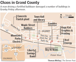 Потім рушив по містечку. Зніс фасади з будинків членів міської ради. Зніс будівлю банку, який намагався натискати на нього через дострокове повернення іпотечного кредиту. Зруйнував будівлі газової компанії “Іксел енерджі”, що відмовилася після штрафу заправляти його кухонні газові балони, будівлю мерії, офіси міської ради, пожежної охорони, товарного складу, декілька житлових будівель, що належали мерові міста. До купи зніс редакцію місцевої газети і публічну бібліотеку, Коротше кажучи, зруйнував все, що мало хоч якесь відношення до місцевої влади, включаючи їхні приватні будинки. Причому проявив хорошу обізнаність про те, кому що належить.