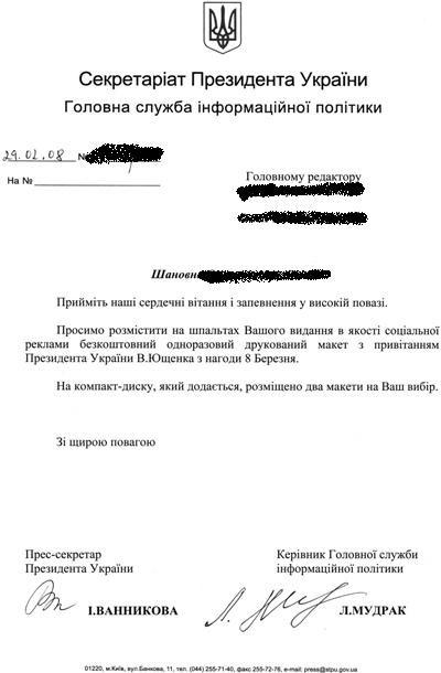 "Телекритика" в свою чергу розмістила копію листа, з яким Секретаріат Президента звернувся до низки друкованих ЗМІ з проханням опублікувати привітання Президента Віктора Ющенка з 8 березня безкоштовно на правах соціальної реклами. Відповідну інформацію підтвердила керівник Головної служби інформаційної політики Секретаріату Президента.